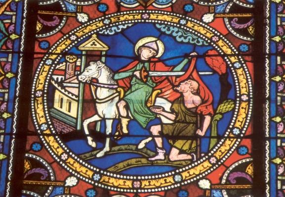 Onderweg kwam hij veel mensen tegen die leden onder de strenge kou. Alle kleren die hij kon missen, gaf hij weg. Zo bereikte hij de stadspoort van Amiens. Hij had alleen nog maar zijn soldatenmantel en zijn wapens. In de poort zat een bedelaar, die helemaal geen kleren aanhad.